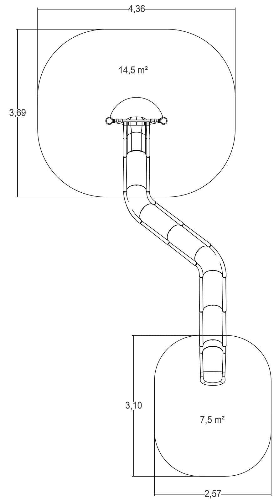 A modul méretei a következők: 6,40 m hosszú, 2,70 m széles, 5,50 m magas. A szabadesési magasság (HCL) 1,00 m.