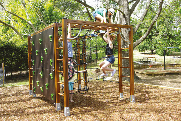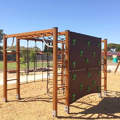Fa mászó játszótéri eszközök kötéllel, mászófallal és létrákkal - J1608