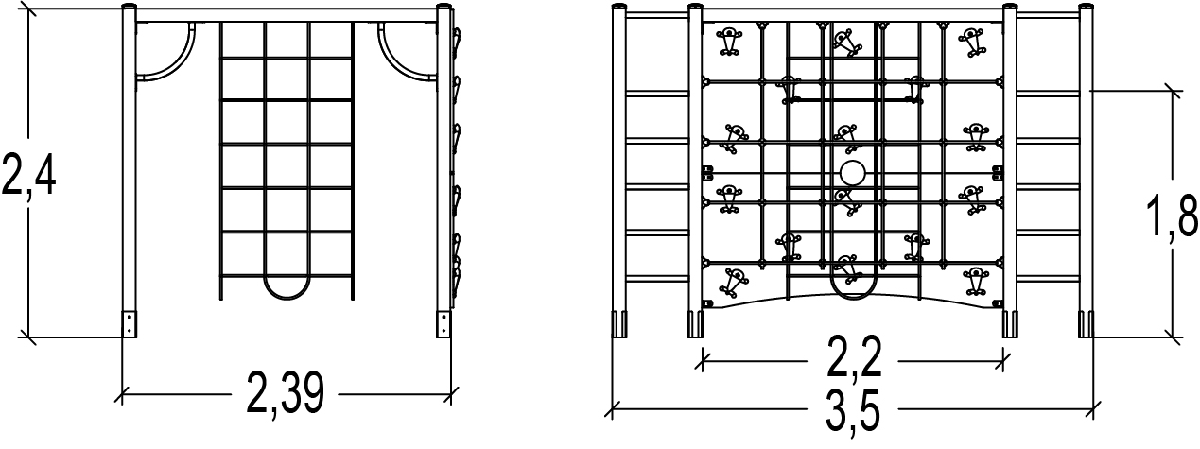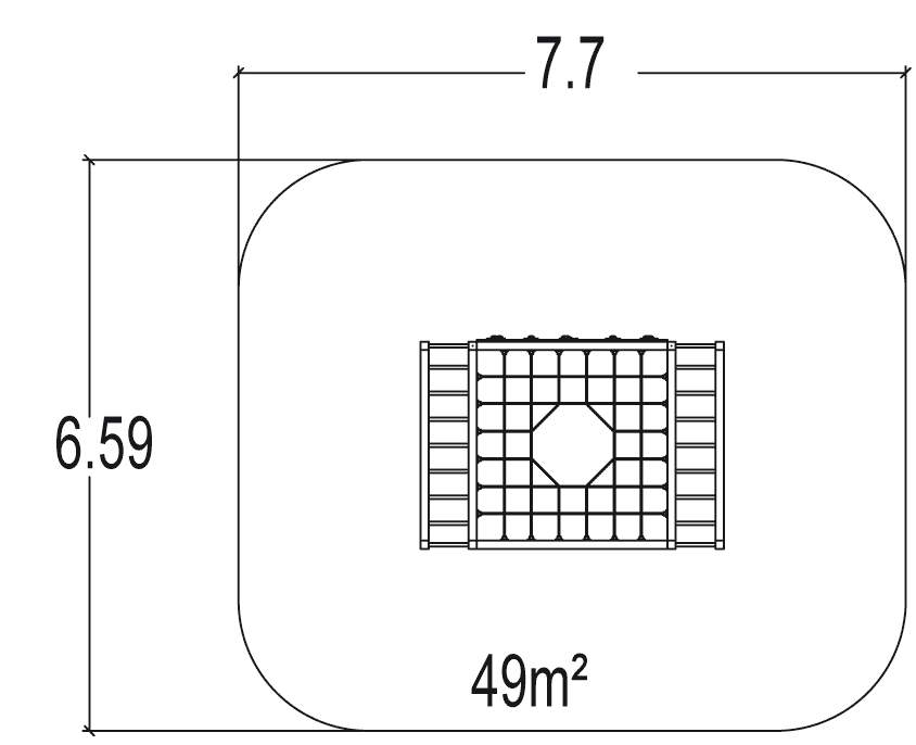 A modul méretei a következők: 3,50 m hosszú, 2,39 m széles, 2,40 m magas. A szabadesési magasság (HCL) 2,40 m.