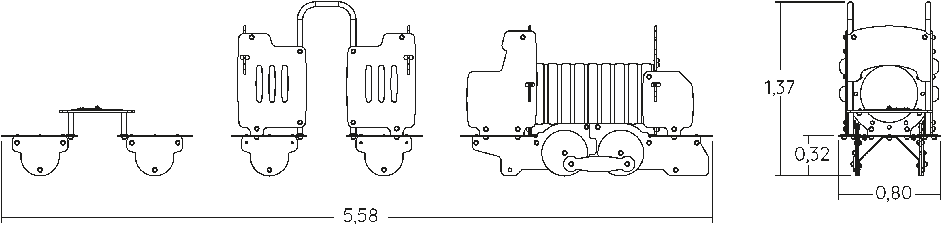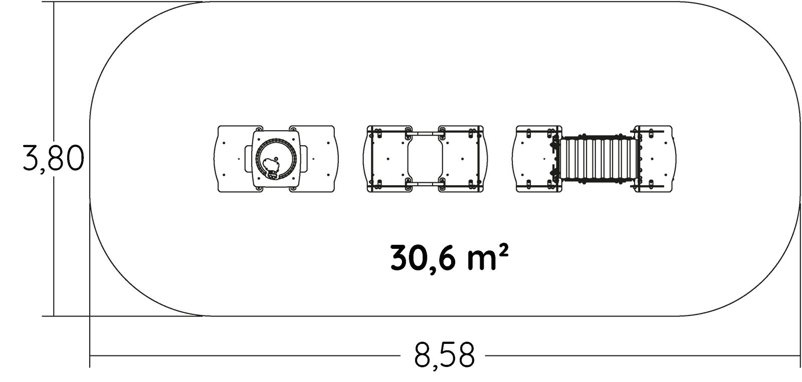 A modul méretei a következők: 5,60 m hosszú, 0,80 m széles, 1,40 m magas. A szabadesési magasság (HCL) 0,86 m.