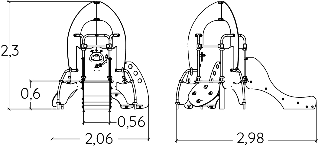 A modul méretei a következők: 2,98 m hosszú, 2,06 m széles, 2,30 m magas. A szabadesési magasság (HCL) 1,00 m.