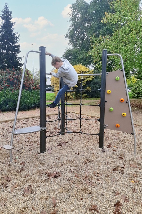 Háromlábú állvány - Fém mászóka játszótéri eszköz kötél elemekkel és mászófallal - J3800-M