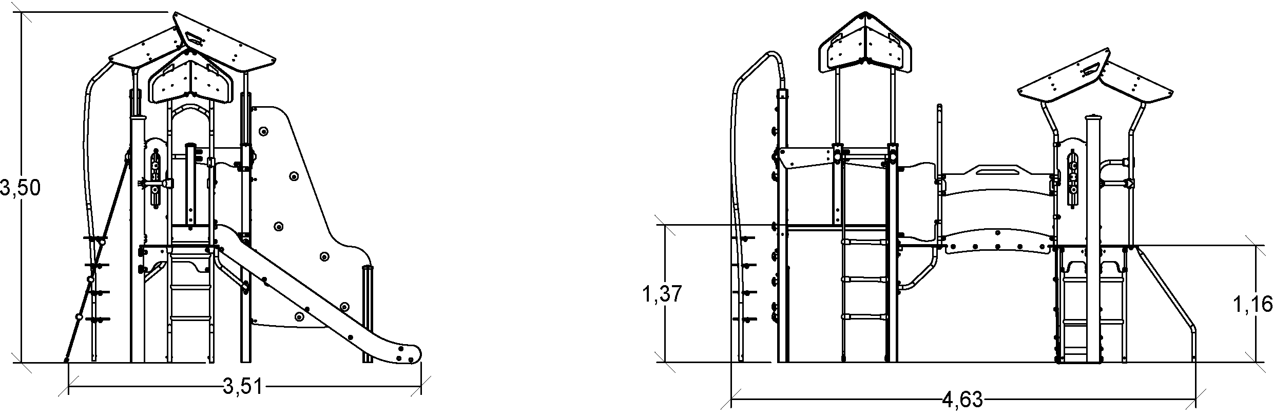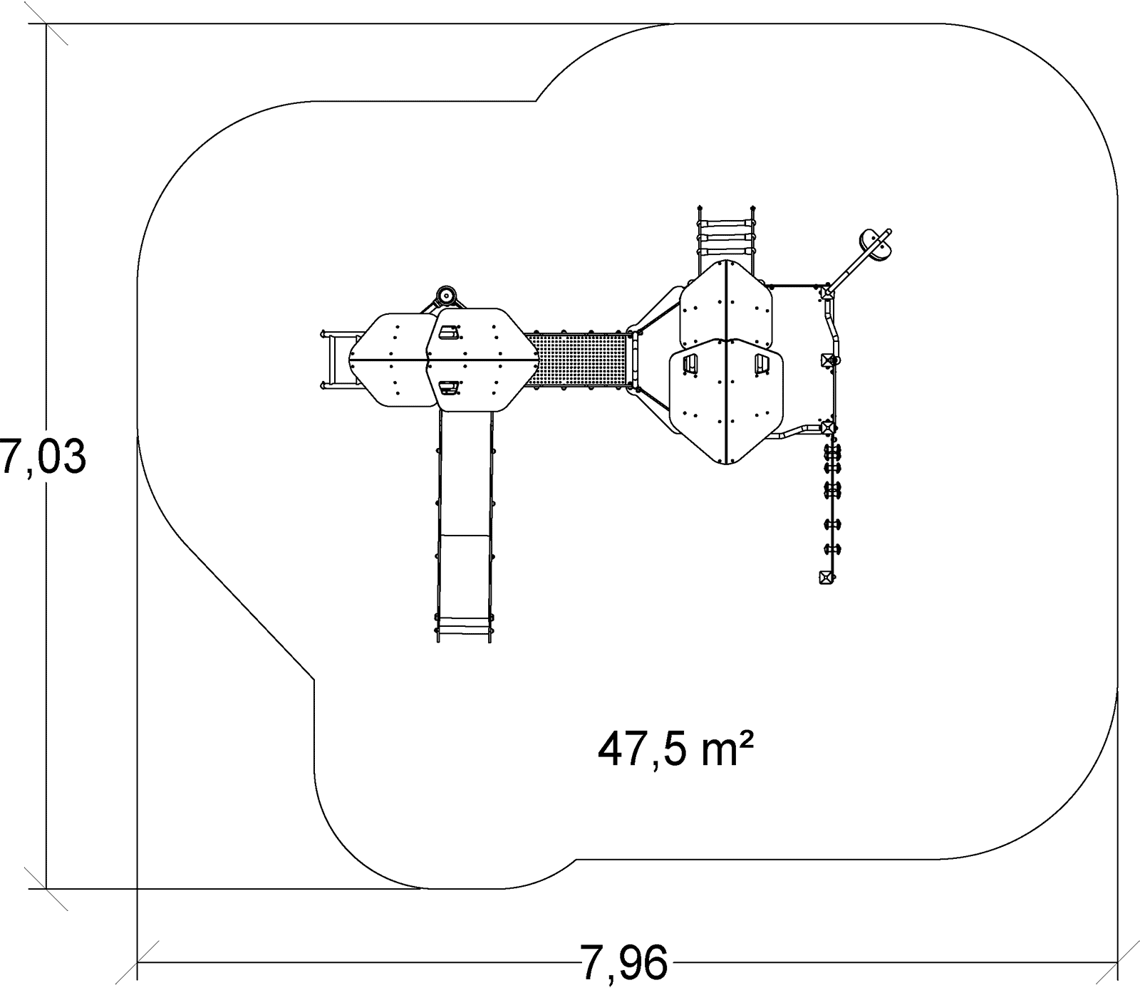 A modul méretei a következők: 4,64 m hosszú, 3,51 m széles, 3,49 m magas. A szabadesési magasság (HCL) 2,60 m.