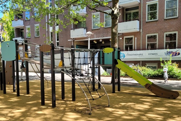 Zöld és kék többjátékos mászófelszerelés csúszdával és kötélhíddal - J38108-C