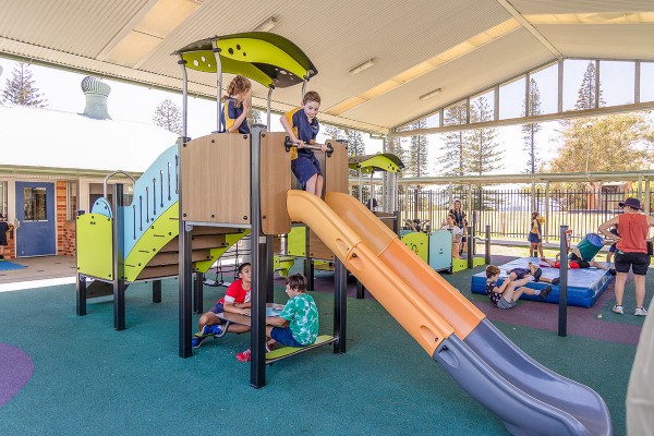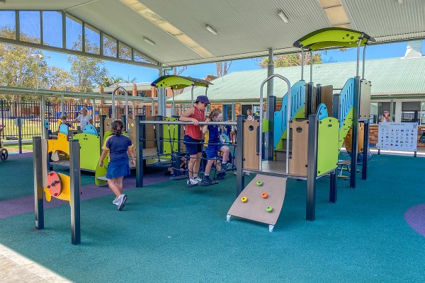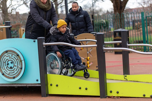Befogadó játszótéri eszközök játéktáblákkal, csúszdákkal, kötélhíddal és akadálymentesített rámpával mozgáskorlátozottak számára, pasztell- és fa színekben - J38122-C