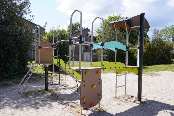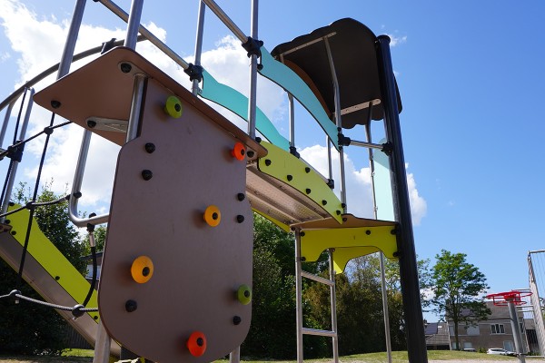 Többjátékos eszközök csúszdával, híddal és mászókával pasztell és fa színekben - J3832-C