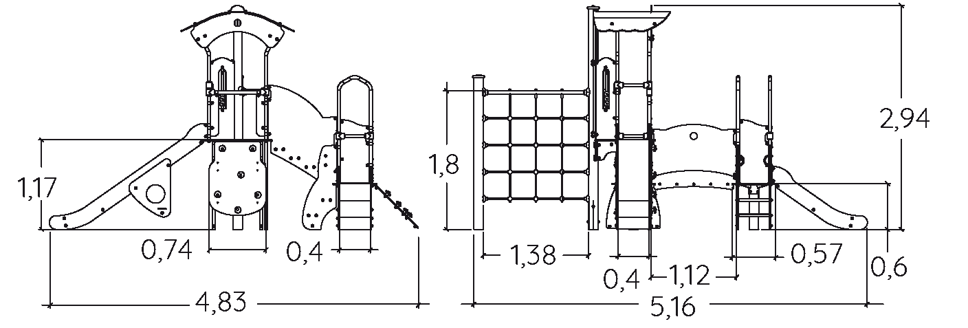 A modul méretei a következők: 5,16 m hosszú, 4,83 m széles, 2,94 m magas. A szabadesési magasság (HCL) 1,80 m.