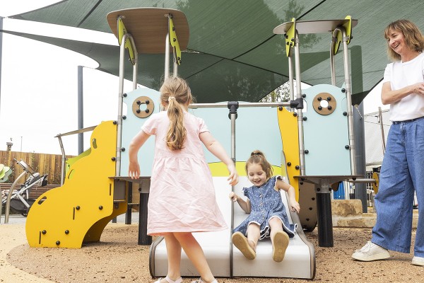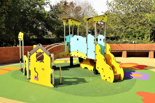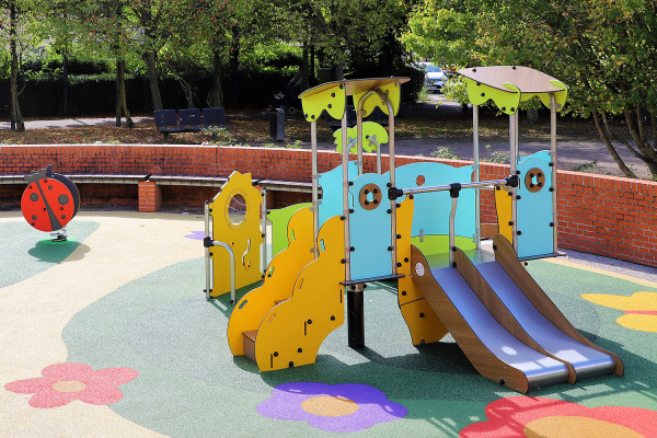 Kisgyermekeknek szóló többjátékos eszközök csúszdákkal és emelt játszóházakkal pasztell és fa színekben, 19 felhasználónak - J38705-C®