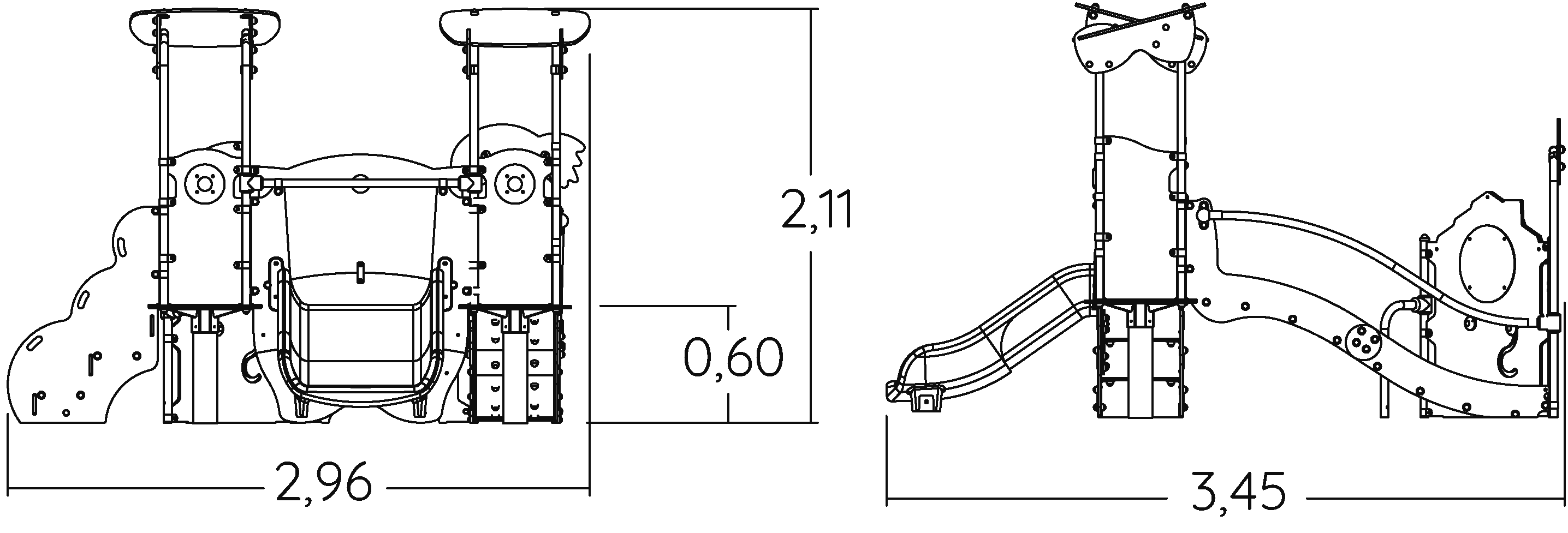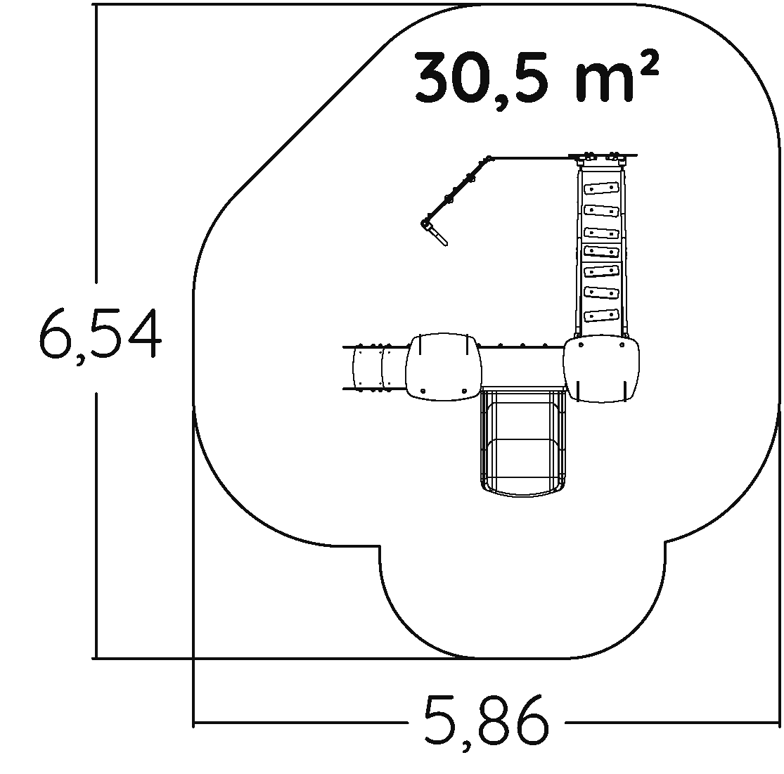 A modul méretei a következők: 3,43 m hosszú, 2,93 m széles, 2,12 m magas. A szabadesési magasság (HCL) 1,00 m.