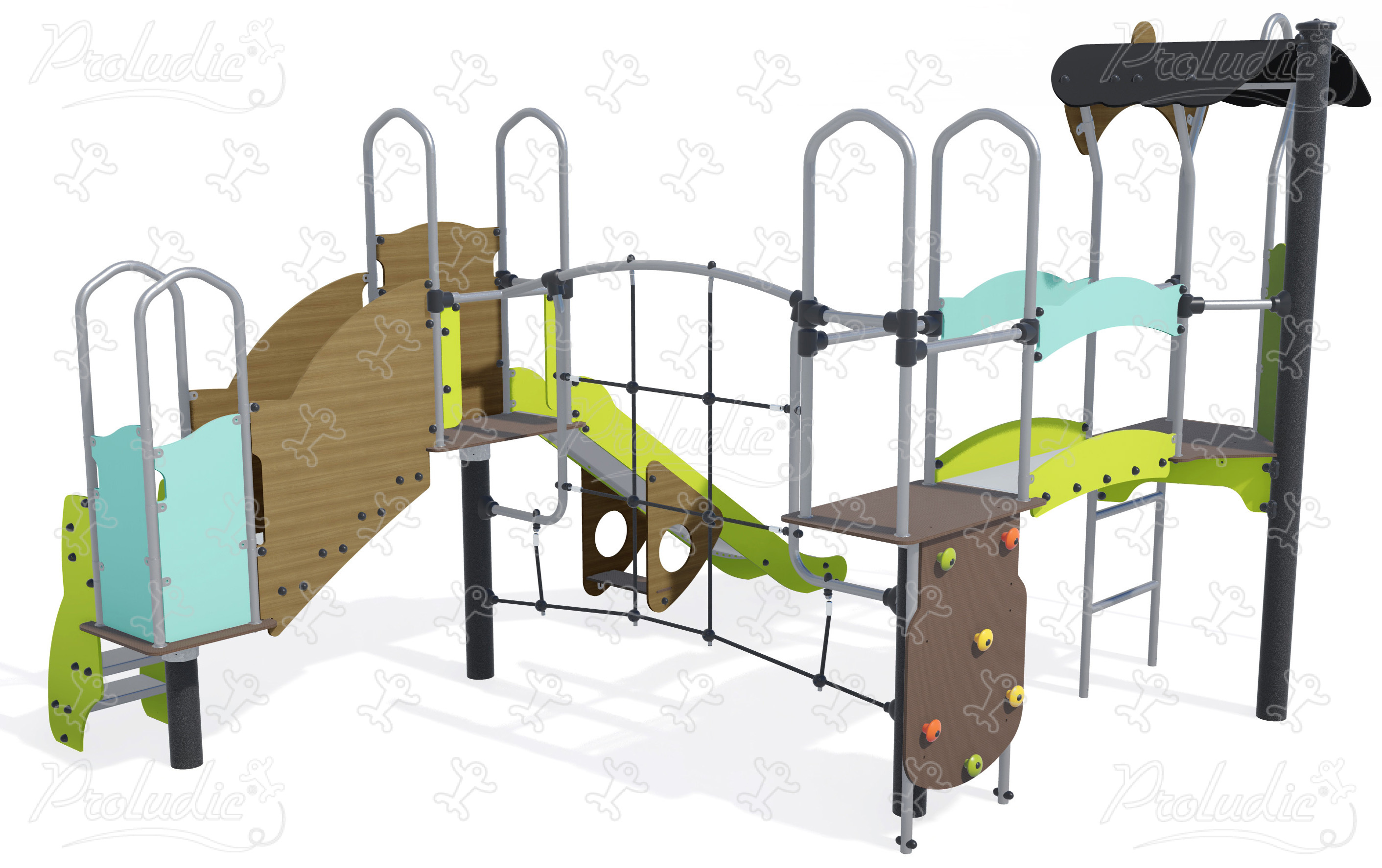 Többjátékos eszközök csúszdával, hálóval és mászókával pasztell- és fa színekben - J3874-C®