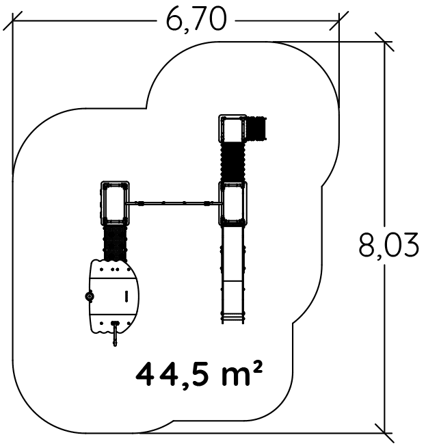 A modul méretei a következők: 4,74 m hosszú, 3,70 m széles, 2,98 m magas. A szabadesési magasság (HCL) 2,00 m.