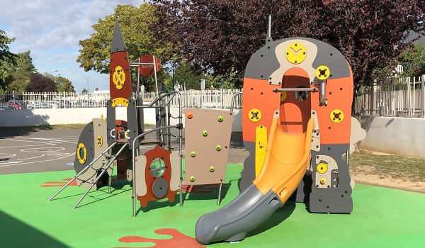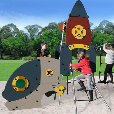 Rakéta és hőlégballon - Többjátékos eszköz csúszdával, mászó tevékenységekkel és játékpanellel - J4082