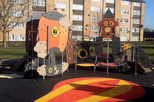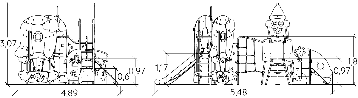 Rakéta és hőlégballon - Többjátékos eszköz csúszdával, mászó tevékenységekkel és játékpanellel - J4092