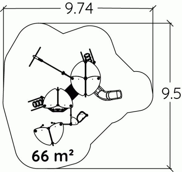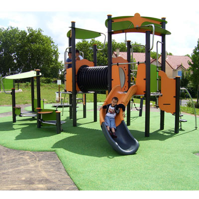 Többjátékos eszközök emelt játszóházzal, egyensúlyozó ösvénnyel, alagúttal és csúszdával - J45202