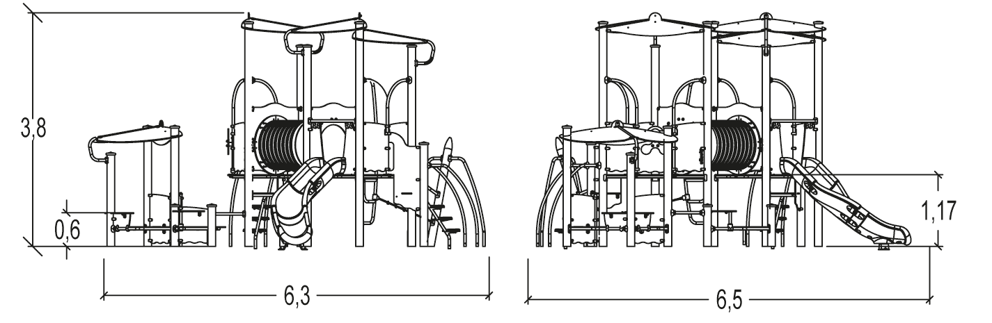 A modul méretei a következők: 6,50 m hosszú, 6,30 m széles, 3,80 m magas. A szabadesési magasság (HCL) 1,17 m.