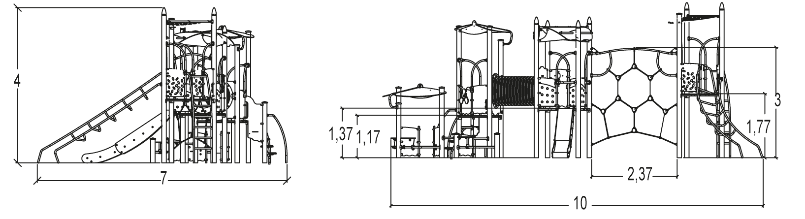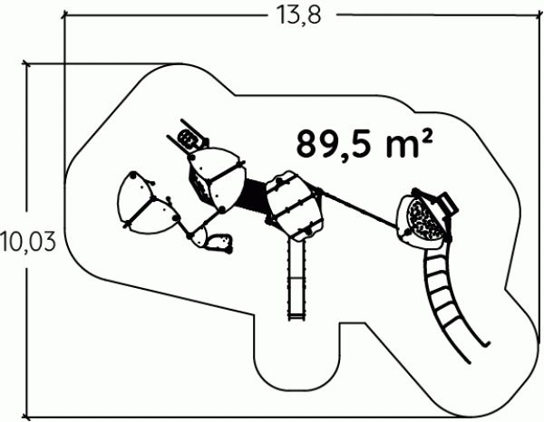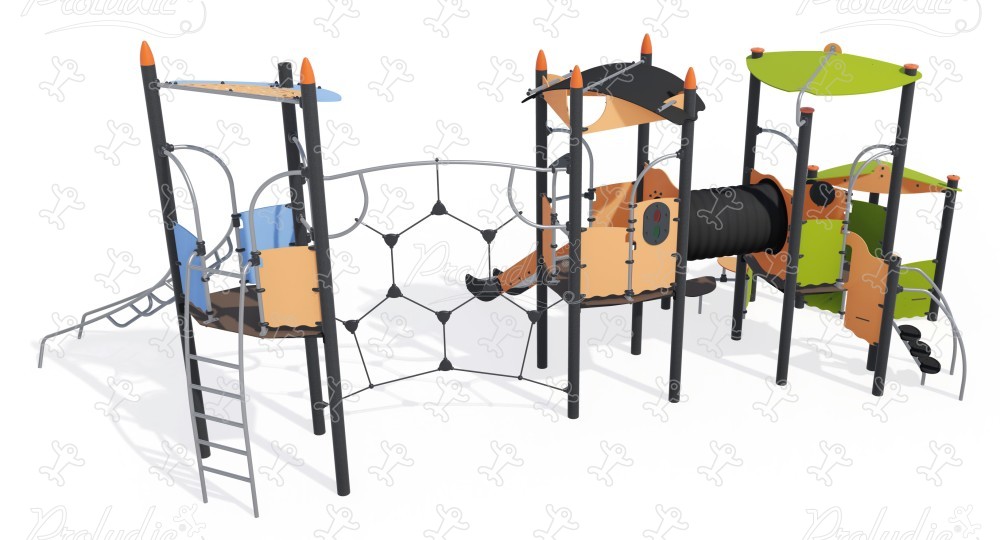 Többjátékos eszközök emelt játszóházzal, egyensúlyozó ösvénnyel, mászó tevékenységekkel, alagúttal és csúszdával - J45416