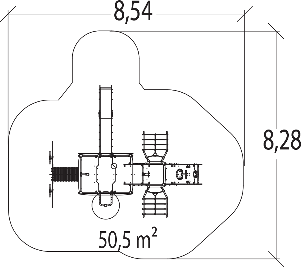 A modul méretei a következők: 5,50 m hosszú, 4,81 m széles, 2,80 m magas. A szabadesési magasság (HCL) 1,70 m.