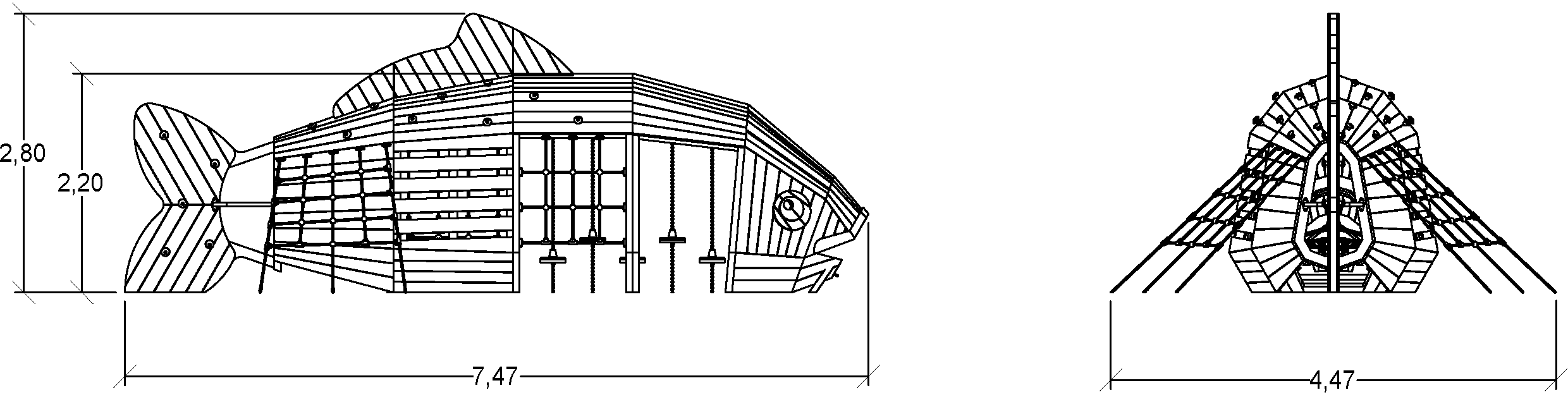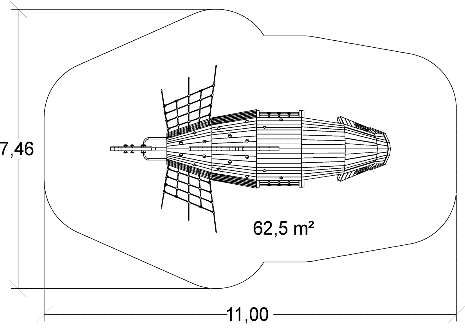 A modul méretei a következők: 7,47 m hosszú, 4,47 m széles, 2,80 m magas. A szabadesési magasság (HCL) 2,20 m.