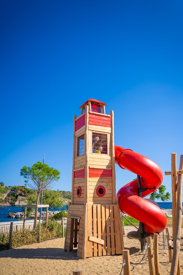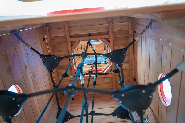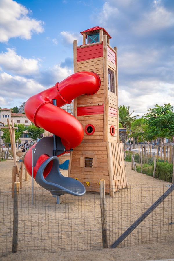 Világítótorony - Fa játszótéri eszköz magas toronnyal és piros csőcsúszdával, pirosra festett elemekkel - J49303®