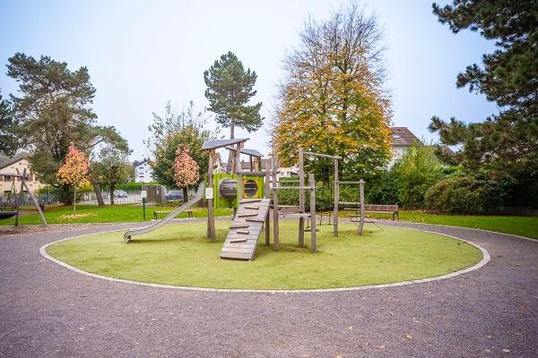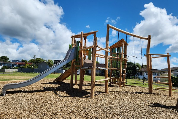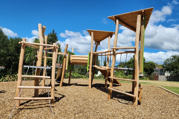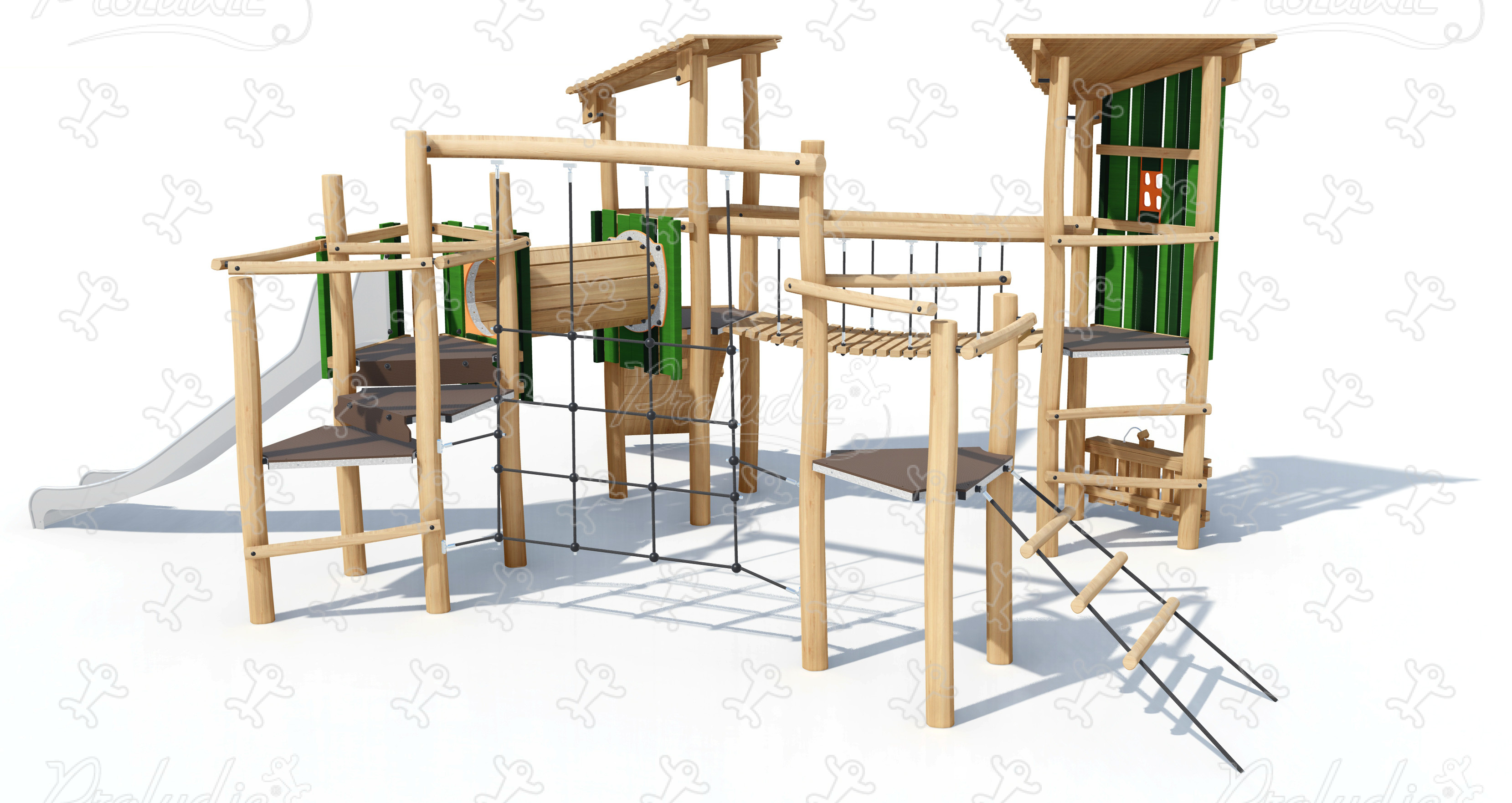 Fa többjátékos játék csúszdákkal, alagúttal, mászófallal és emelt játszóházzal - festett zöld elemekkel - J4947-V