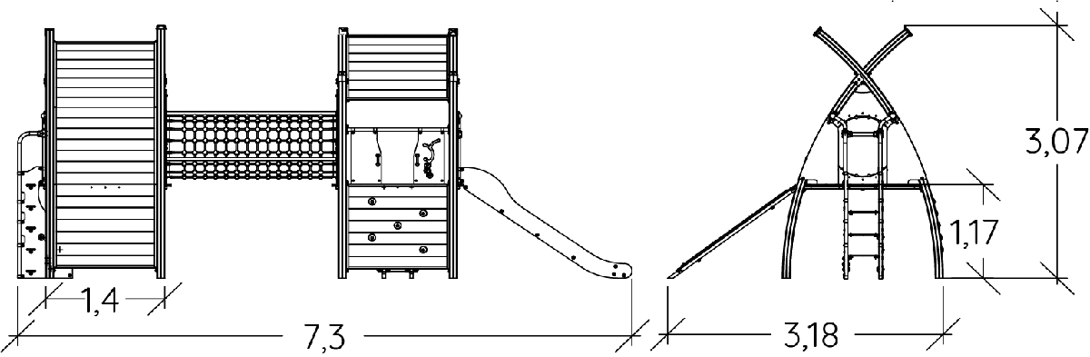 Többjátékos eszközök mászó tevékenységekkel, hálóalagúttal, emelt játszóházakkal és csúszdával - J5605