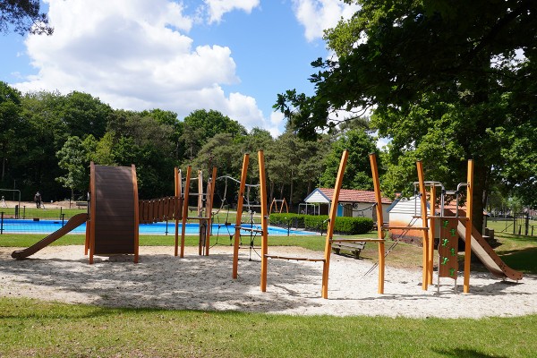 Többjátékos eszköz csúszdákkal, emelt játszóházzal és egyensúlyozó pályával fahatású színben - J5613-C®