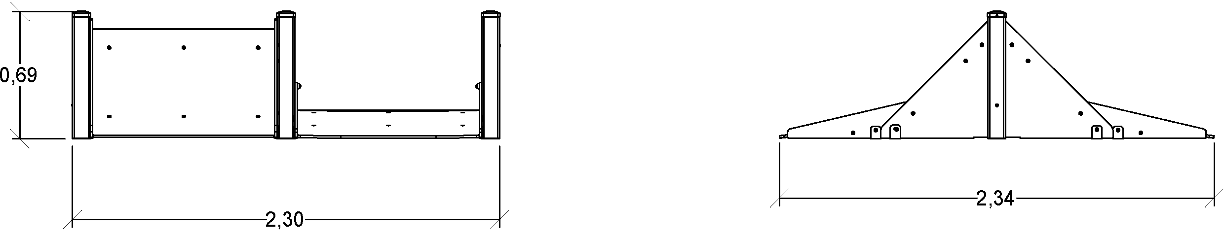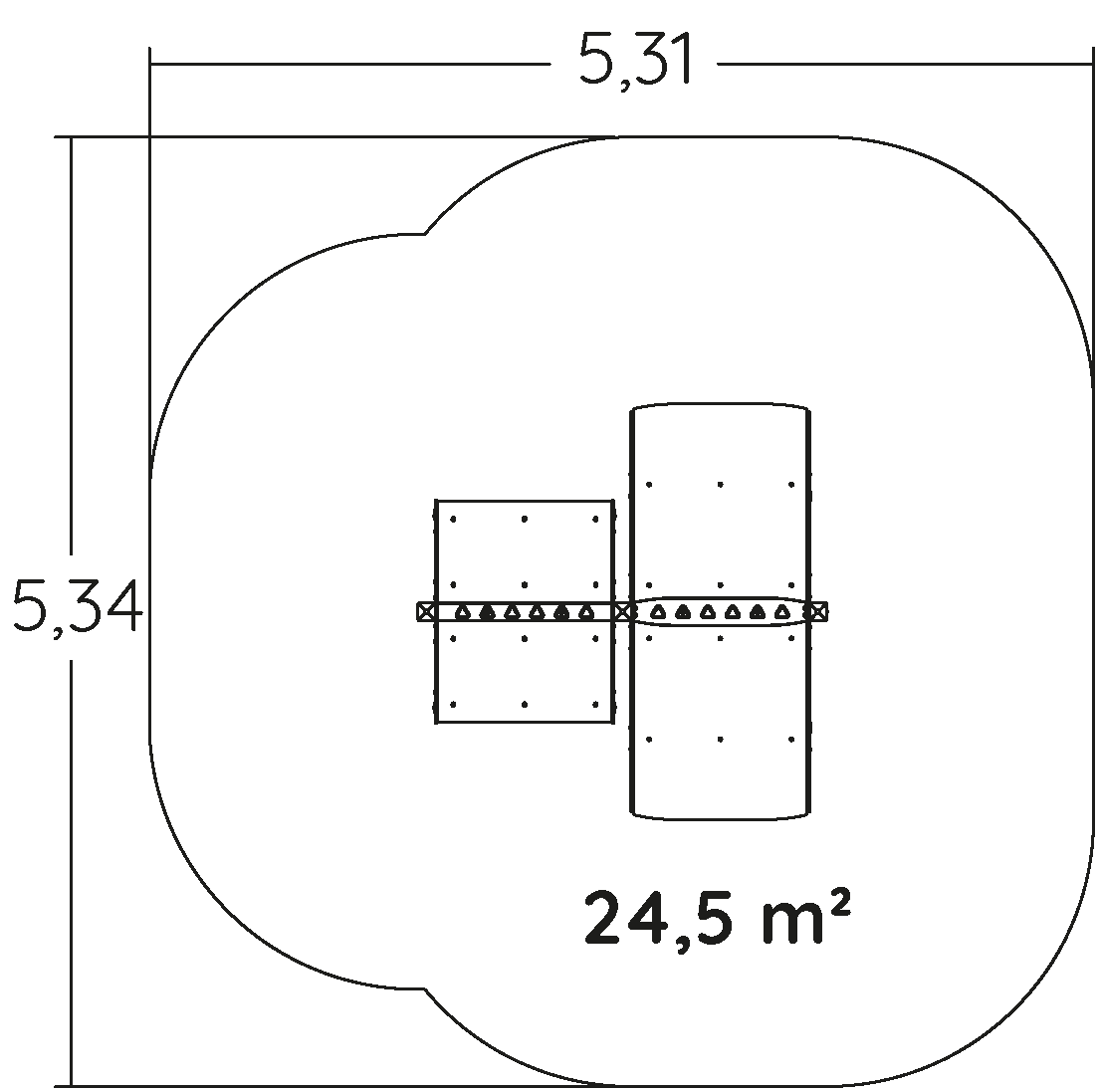 A modul méretei a következők: 2,34 m hosszú, 2,30 m széles, 0,68 m magas. A szabadesési magasság (HCL) 0,60 m.